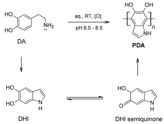 - Liebscher, J. Chemistry of Polydopamine—Scope, Variation, and Limitation. Eur. J. Org. Chem. 2019, 31, 4976–4994. [Google Scholar] [CrossRef]