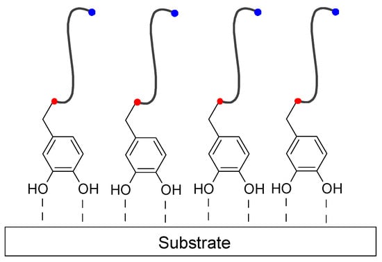 Adsorption of catechol-functionalised molecules on metal and metal oxide surfaces follows a similar mechanism, where the bisphenol moieties form mono-catecholate complexes with metal ions on the substrate’s surface [20,57,61]. Scheme 2d provides a generalised depiction of surface adsorption of catechol-bearing species. It is clear that the nature of the R-group will influence the exact adsorption geometry and surface coverage with any steric or intermolecular effects, as well as ultimately the adhesion strength and the quality of the formed adsorbate layer. For example, the presence of amide-bond-induced hydrogen bonding between the chains of N-stearoyldopamine (where R = –NHCO(CH2)16CH3, as per Scheme 2d) adsorbed on gold surfaces results in a tilted geometry and a more robust monolayer compared to 4-stearylcatechol, where R = –(CH2)15CH3 [62].