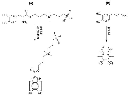 It has to be noted here that the oxidative activation of the catechol ring to its o-quinone counterpart is directly linked to some of the most well-known relevant synthetic polymers, which stem from the oxidative self-polymerisation of catecholamine structures, with dopamine (Scheme 1) and polydopamine (PDA) formation being the first reported and most prominent example [65]. Polycatecholamines and polydopamine are reviewed further in Section 3.2.4.