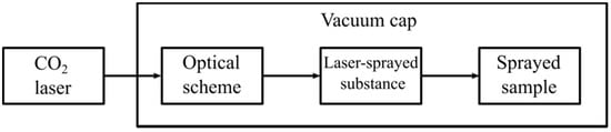 To modify the considered material’s surface the IR CO2 laser operated at the wavelength of 10.6 μm with the power of 30-W and a beam diameter of 5 mm was used. This laser was connected with the vacuum chamber. The CNTs were placed at the materials interface under the conditions when an additional electric field of 100–600 V·cm−1 was applied in order to orient the nanotubes in the vertical position during the deposition process. Thus, the LOD method was realized efficiently. The general view of the applied block scheme is shown in study [20]. Some view of the block scheme of the experimental deposition technique is shown in Figure 2.