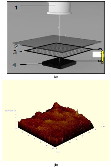 Possible evidence to orient the CNTs. (a) 1—CO2 laser, 2–substrate (samples), 3—metal grid, 4—carbon target; (b) view of the treated sample obtained via AFM. Axes in microns (x and y) and microns ×10−3 at z axes.