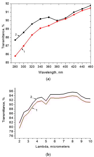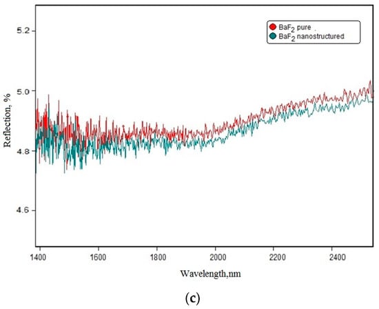 The change of the transmittance spectra in the range of 250–450 nm and in the range of 2–10 microns of the BaF2 + CNT are shown in Figure 4. It was observed the strong transparency increasing in the range of the wavelength of 280–380 nm and of 2–3% transparency change in the range of 2–10 microns. It should be remarked that the increase of the transparency could be explained by the decrease of the Fresnel losses. Really, it may be because of the refractive index of the CNTs was close to 1.1 that was substantially less than for the nanostructured BaF2 materials (n~1.38–1.39 at the operated wavelength of 10.6 μm). Thus, the analytical calculation via the fundamental Fresnel formulas [23] could predicts the change of the reflection up to 1–2%, which coincided with the increased experimental value of the transparency up to 2% and not less after the surface structuration of the BaF2 substrate. Data presented in Figure 4c is regarded to the reflection parameters change. One can see that these data coincided with the theoretical Fresnel losses estimated by the analytical calculations.