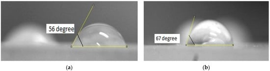 The spectra of the nanoobject-treated materials were measured using the IR Furrier FSM-1202 instruments (“Modern Lab”., Moscow-St-Petersburg-Ekaterinburg, Russia) as well as using the VIS SP-26 spectrophotometer operated in the spectral range of 250–1200 nm. POLAM-P312 microscope (“LOMO”, Saint-Petersburg, Russia) was applied to make the image of the materials treated. The microhardness was measured via using the PMT-3M device produced by “LOMO” plant (St. Petersburg, Russia) with the ability to vary an indenter force as well. The special accent was given to observe the relief at the material surface via checking the wetting angle. In this case, the camera with parameters as compact F1.6 1/3 CS mount 6.0–60 mm manual focal iris zoom lens for CCTV camera (black) was applied. Moreover, the OCA 15EC device was purchased from LabTech Co. Ltd. (St. Petersburg–Moscow, Russia) and was used to carefully control the wetting-angle change too.