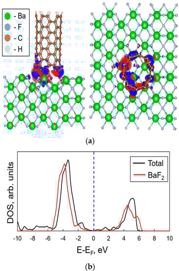 We also calculated the changes in the electronic properties caused by the presence of the deposited CNT. The distribution of electron density was plotted and the electronic density of states was calculated (see Figure 6b). Results indicate weak redistribution of electron density near the BaF2/CNT interface (Figure 6, upper panel). Moreover, the dependence of the DOS on the energy also manifests about the weak interaction between the tube and the substrate (the shape of the main peaks remains, see bottom panel in Figure 6). Deposition of the CNT leads to the small shift of the electron density peak (around −4 eV) towards the blue region of solar spectra on ~1 eV. Deposition of the CNT also leads to the appearance of a certain number of energy levels close to the Fermi level, which can be seen from Figure 6.