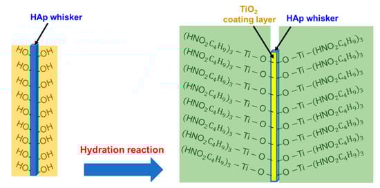 Diagram illustration of the formation of a continuous TiO2 coating layer around the surface of the HAp whiskers via the hydration reaction between the surface hydroxyl of HAp and hydrolyzed Ti(OC4H9)4.