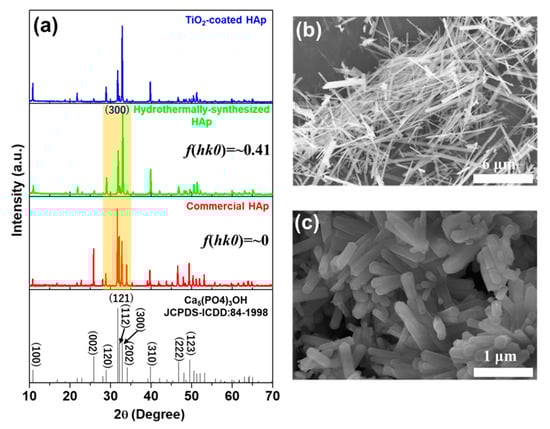 (a) XRD patterns of the commercial, hydrothermally-synthesized, and TiO2-coated HAp powders, denoting the calculated Lotgering factors of f(hk0); and FE-SEM images of unique morphologies in (b) the hydrothermally-synthesized whisker-like and (c) commercial rod-like HAp particles.