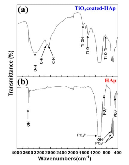 Figure 3 shows the FT-IR spectra of (Figure 3a) the TiO2-coated HAp and (Figure 3b) hydrothermally-synthesized HAp. For the hydrothermally-synthesized HAp, the characteristic absorption bands at 1106, 1027, 962, 603, 567, and 472 cm−1 are assigned to the asymmetric stretching vibration of the PO43− groups, and at 3570 and 633 cm−1 are attributed to the stretching and liberation vibrations of the OH− groups []. For the TiO2-coated HAp, the band at 821 cm−1 is assignable to the Ti–O–Ti bond, the one at 1460 cm−1 is related to the Ti-O mode, and the one at 1638 cm−1 corresponds to the bending vibration of Ti–OH [,]; moreover, the 2937 and 2862 cm−1 bands are assignable to the C–H stretching from the remaining ethanol in the product powder [,], and a wide band at 3340 cm−1 belongs to the asymmetrical stretching vibration of the O–H group in the free water [] from the amorphous TiO2 coating layer.