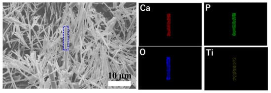 Figure 4 shows the FE-SEM images of TiO2-coated HAp particles with the detection of component elements by EDX local mapping. Even though the hydrothermally-synthesized HAp particles were coated with the TiO2 layer around their surface, their unique whisker-like shape suffered no influence and retained the initial morphology, as comparably observed in Figure 2b and Figure 4. For the EDX mapping detection, not only were the main component elements of Ca, P, and O for HAp detected; additionally, the Ti element for the TiO2 coating layer was spotted, indicating the existence of the TiO2 coating layer around the HAp surface.