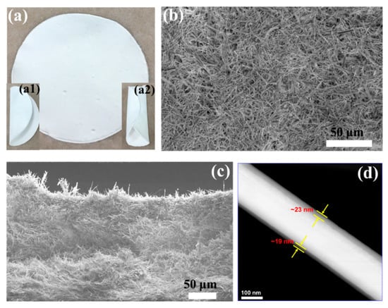 Figure 5 exhibits (Figure 5a) a photograph of the membrane fabricated by using TiO2-coated HAp whiskers, with the (a1) and (a2) insets showing the membrane images after bending, FE-SEM micrographs of (Figure 5b) surface and (Figure 5c) cross-section observations for the membrane, and (Figure 5d) STEM micrographs revealing the thickness of the TiO2 coating layer by observing a single TiO2-coated HAp particle. As is clearly seen in Figure 5a, the membrane fabricated by using TiO2-coated HAp whiskers presents a white, free-standing, and highly flexible-like paper, even after arbitrarily bending without any damages (insets of Figure 5(a1,a2)). The surface and cross-section observation of the membrane (Figure 5b,c) show a nest-like microstructured surface and ~210 μm thickness, respectively. To reveal the thickness of the TiO2 coating layer, a STEM observation was performed upon a single TiO2-coated HAp particle, as demonstrated in Figure 5d. One can obviously distinguish that the coating layer was formed with a thickness of ~23 and ~19 nm for either edge of the TiO2 coating, respectively.