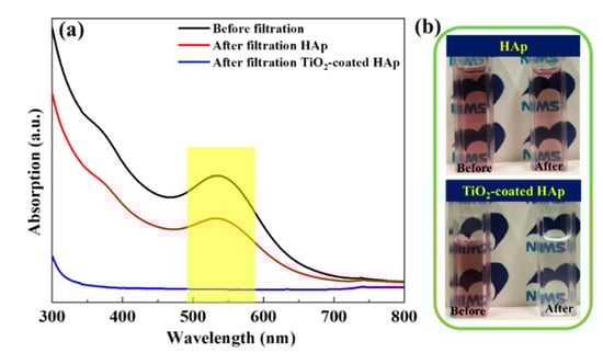 (a) UV-vis spectra of the Au colloidal suspensions before and after the filtration by using the membrane fabricated by the HAp and TiO2-coated HAp whiskers; (b) photographs showing the color difference of these Au colloidal suspensions.