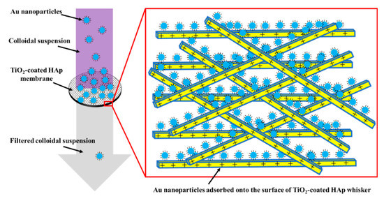 Schematic illustration of the Au colloidal suspension filtered by the TiO2-coated HAp membrane, with a locally enlarged schema to illustrate the adsorption of Au nanoparticles onto the surface of the TiO2-coated HAp whisker as a result of the electrostatic attractive interaction of their negative and positive surface charges.