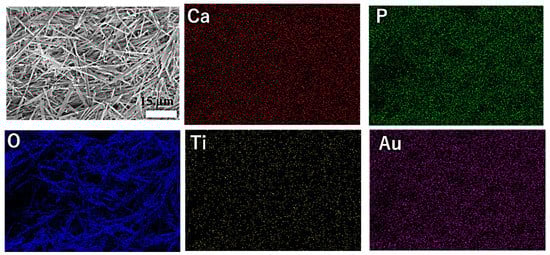 Figure 8 shows the FE-SEM micrograph of the surface of the TiO2-coated HAp membrane after the filtration using EDX element mapping to detect, in particular, the captured Au nanoparticles. After the filtration, the separated Au nanoparticles could not be distinguishably seen from the FE-SEM observation on the surface of the TiO2-coated HAp membrane; however, the EDX element mapping not only detected the main component elements of Ca, P, and O for the HAp whiskers and that of Ti for the TiO2 coating layer, but also, more evidently, that of Au was clearly detected for the adsorbed Au nanoparticles.