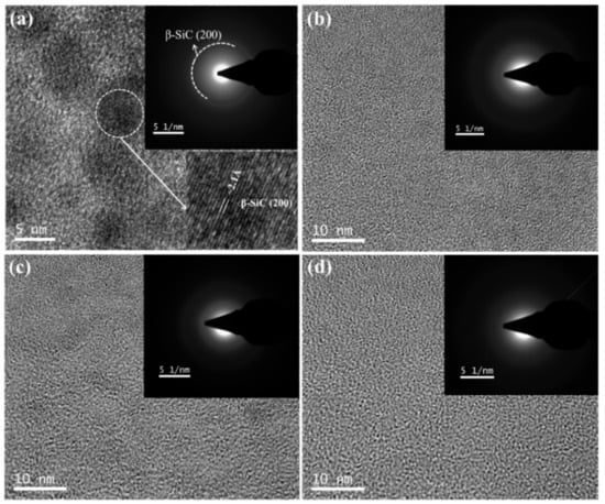High-resolution transmission electron microscopy (HRTEM) images and the corresponding SAED patterns of the Si-DLC films deposited at different CH4 flow rates of: (a) 20 sccm, (b) 60 sccm, (c) 100 sccm, and (d) 150 sccm on NBR.