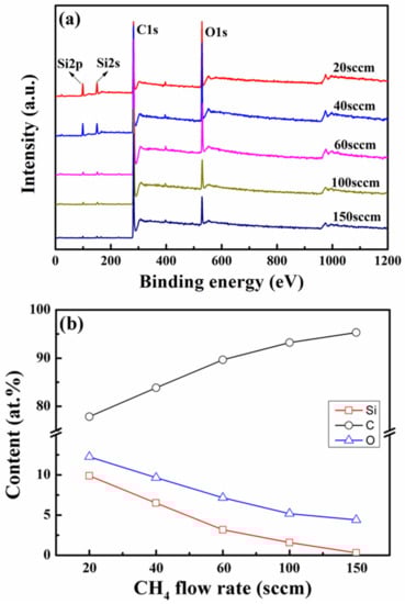 (a) The typical X-ray photoelectron spectroscopy (XPS) survey spectra and (b) chemical composition of the Si-DLC films deposited at different CH4 flow rates.