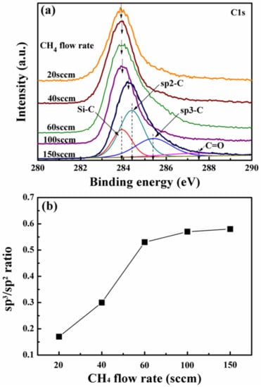 XPS C1s spectra (a) and the sp3/sp2 ratio (b) of the Si-DLC films deposited at different CH4 flow rate on NBR.