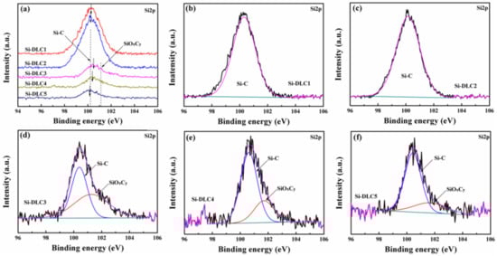 (a) the Si2p spectra of the Si-DLC films deposited at different CH4 flow rate on NBR, and the fitted Si2p spectrum of (b) Si-DLC1 film, (c) Si-DLC2 film, (d) Si-DLC3 film, (e) Si-DLC4 film and (f) Si-DLC5 film.