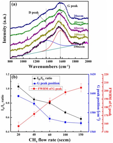 (a) Raman spectra and (b) ID/IG ratio, FWHM (full width half maximum) of G-peak and G position of the films deposited at different CH4 flow rate on NBR.