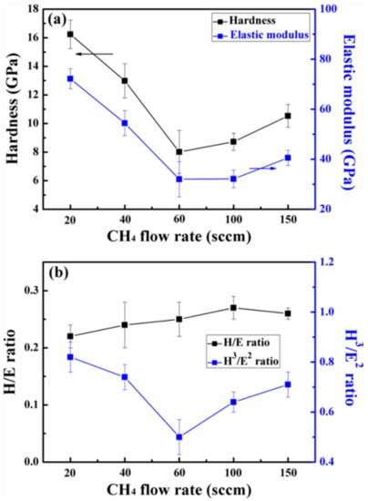 (a) Hardness, elastic modulus and (b) ratio of hardness and elastic modulus (H/E and H3/E2) of the films deposited at different CH4 flow rate on Si wafer.