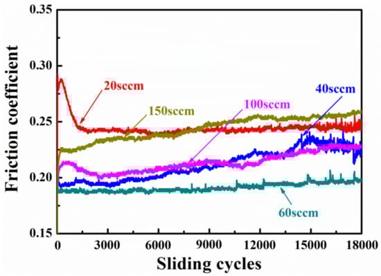 Friction coefficient of films deposited at the different CH4 flow rate on NBR under the load of 3 N.
