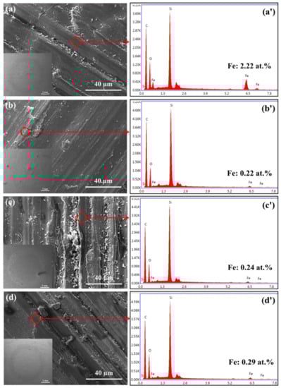 SEM images of the wear tracks of the Si-DLC films deposited at the different CH4 flow rate of (a) 20 sccm, (b) 60 sccm, (c) 100 sccm, and (d) 150 sccm on NBR, and the corresponding EDS analysis (a’–d’) of the wear tracks.