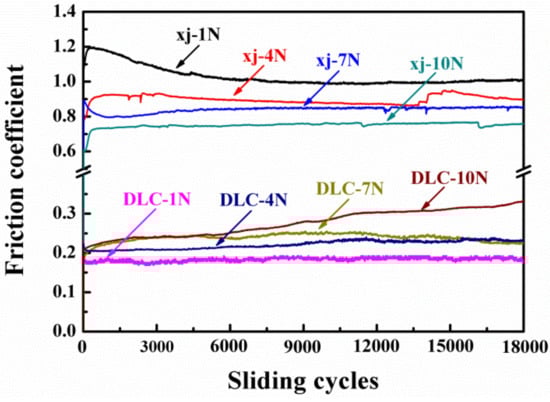 With the exception of the mentioned above, these research works have been made with an emphasis on the hardness, hydrocarbon precursors or doping materials, and the tribological performance of DLC coated NBR was not well explored. Just like other carbon materials, the tribological behaviors of DLC films are strongly sensitive to the test conditions, especially the friction loads. Generally, the friction coefficient decreases as increasing the friction load for DLC films on hard substrate. So far, various theories have been proposed to explain this phenomenon as follows: (1) Hertzian elastic contact theory. It is mainly used to explain the influence of friction load on the tribological behavior, and the friction coefficient decrease as increasing contact pressure [,,]; (2) Graphitization. This classic theory holds that the friction thermal effect will lead to the transformation of sp3 to sp2, i.e., form the graphitized tribo-layer on the coating surface [,]; and (3) Transfer film. The graphitized wear debris could gradually transfer to the counterpart surface and form an easy-to-shear transfer film [,,]. The occurrence of graphitization and the formation of a transferred tribo-film are considered to play the significant role in achieving low friction in DLC films under a high load. Unlike hard substrates, however, the viscoelasticity of soft substrates can lead to a significant change in the contact state, and thus the tribological behavior of DLC films on soft substrates must be different from that on hard substrates.