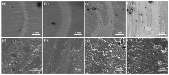 SEM images of wear track of the virgin NBR rubber under the load of (a,e) 1 N, (b,f) 4 N, (c,g) 7 N, and (d,h) 10 N.