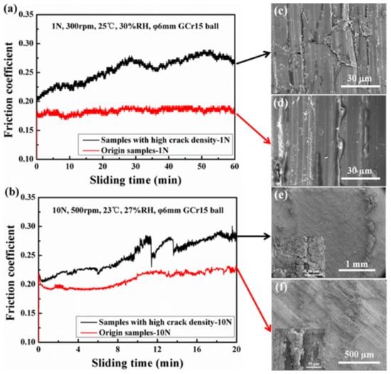 (a,b) The friction coefficient curves and SEM images of wear track of the crushed films (c,e) and the original samples (d,f) under the load of 1 N and 10 N.