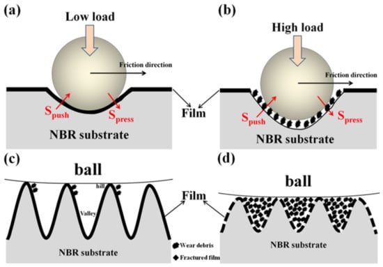 Schematic diagram of frictional mechanism for DLC film coated NBR under (a,c) a low load and (b,d) a high load.