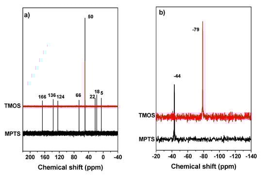 The chemical shift of MPTS signal detected in 29Si spectra at −44 ppm was assigned to RCH2–Si(OR)3 environments, whereas the signal of TMOS at −79 ppm was associated with Si(OR)4 environments.