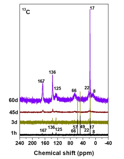 Over time, this process was repeated successively until all the alkoxide groups are replaced, an increase of the intensity of this resonance was observed after 3 days. The rest of the spectra corresponding to the first hours were not shown in Figure 2 because they were identical to those obtained after 3 days. The hydrolysis was not completed because the spectra exhibited an appreciable amount of residual ethoxide groups (signals at 17 and 57 ppm) from the ethanol used as a solvent. After 45 and 60 days, the condensation reactions occurred between the resulting hydroxyl groups, leading the formation of a three-dimensional network, as deduced from the corresponding 29Si NMR spectra. It was reflected in 13C NMR spectra, where differences were clearly observed: signals become broader and resonances at 49 and 57 ppm disappeared. The important broadening of the peaks was an indication of a loss of mobility due to the advancement of the polycondensation.