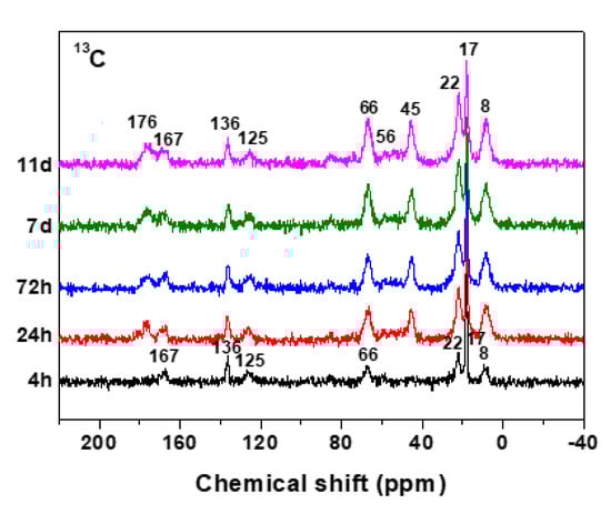 After 24 h, the spectrum showed three new resonances at 45, 56 and 176 ± 1 ppm, assigned to quaternary carbon atoms, the aliphatic –CH2– groups and C=O groups bonded to aliphatic carbon groups, after the C=C opening [29]. The presence of these signals confirmed the second stage of condensation, specifically the formation of a cross-linked organic part through the vinyl groups of the methacryloxy group. Despite this, the intensity of the peaks at 167, 136 and 125 ppm remained practically constant, indicating that part of CH2=C and C=O groups did not intervene in this reaction and the condensation via hydroxyl groups also took place. The spectra recorded between 3 and 11 days were of similar appearance and had the same number and position of signals.