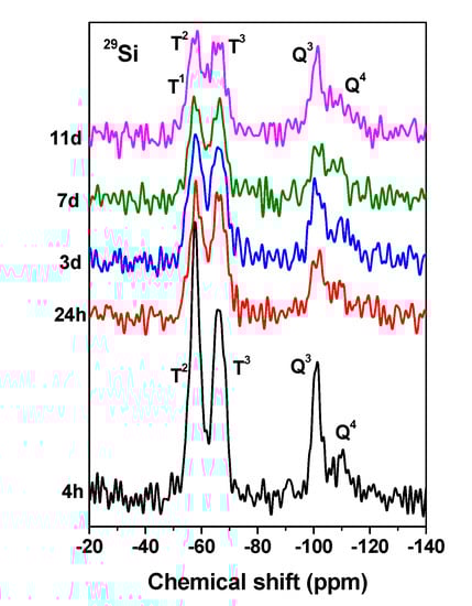 Two methodologies were employed to study the effect of the temperature on the hydrolysis and condensation mechanisms. In the first one, the polysiloxane hybrids were directly analyzed by nuclear magnetic resonance (NMR, Karlsruhe, Germany) spectroscopy at different times (up to 60 days), while on the other hand, these materials were also dried at 65 °C for 4, 24, 72 h, 7 and 11 days and analyzed by NMR spectroscopy with the same purpose.