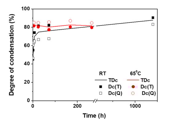 Figure 6 shows the evolution of the total condensation degree, condensation degree of T species and Q species for polysiloxane hybrids synthesized with and without thermal treatment at different times. The hybrid materials synthesized without drying presented an initial total condensation degree (TDC) of 46%. This value increased over time, but it did not reach a value of 75% until 3 days. At the end of the experiment, TDC was 88%. The hybrids synthesized at 65 °C showed a TDC between 80% and 83% independently of the curing time, indicating the condensation of the species was more favored from the first hours. Therefore, the total condensation degree depended on a great extent on the temperature and an initial thermal treatment obtaining a more polymerized network.