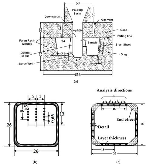 All the test castings are poured at 1450 °C in furan resin moulds. A furan resin (3.0 wt.%) and P-toluol sulfonic acid (PTSA) (6.53 wt.% S content and 1.5 wt.% addition) bonded silica sand (95.5 wt.%) (FRS-PTSA) moulding system is used. Four pyramid trunk with square section test samples are cast in this mould according to Figure 2a presentation: 34 mm × 22 mm × 40 mm, 6.24 mm cooling modulus, 0.52 kg weight.
