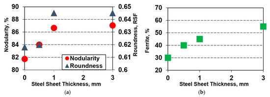 Influence of the steel sheet thickness on the graphite nodularity (N) and graphite roundness shape factor (RSF) (a) and ferrite amount (b) in the casting body (see Figure 2b).