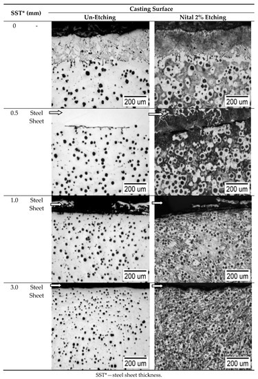 Structure in the ductile iron casting body (un-etching and Nital 2% etching) at different thicknesses of the steel sheet (SST) applied on the inner mould surface, before pouring.