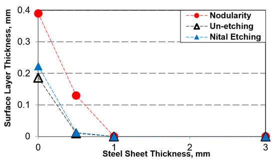 Parameters’ evolution on the casting section. The influence of the steel sheet thickness on the degenerated graphite surface layer (skin) thickness is shown in Figure 10.