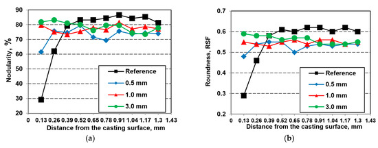 Influence of the steel sheet thickness on the graphite nodularity (a) and graphite roundness shape factor (b) at different distances from the casting surface (see Figure 2c).