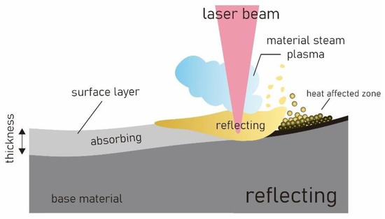 Researchers proposed three basic mechanisms for laser cleaning, namely pure vaporization, explosive removal caused by pressure buildup at the bottom interface, and two-phase removal caused by partial film evaporation and subsequent liquid discharge [22,31,32]. Under the laser beam radiation, the coating material is subjected to three types of thermal expansion of the particles, thermal expansion of the substrate surface, and light pressure applied to the particles. The combined force of these forces is the cleaning force. When the cleaning force is more powerful than the adhesion force of the surface of the object to the coating, the coating will fall off, so that the outer surface of the material is washed as shown in Figure 1.