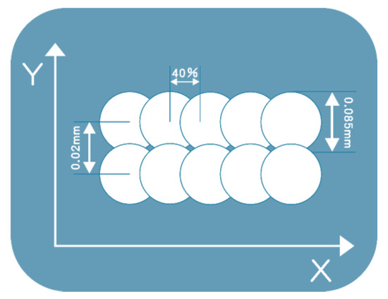 The laser parameter setting consists of five parts: spot overlap rate, linear interval, spot diameter, pulse frequency, and number of cleanings. In Figure 2, the laser generator emits multiple laser beams and aligns them along the Y direction. During cleaning, the laser generator moves along the X direction, so that a straight line of laser lines cleans the sample surface along the X direction. As shown in Figure 2, 0.085 mm is the spot diameter, 40% is the overlap rate between two adjacent spots in the same row of spots, and 0.02 mm is the distance between the centers of the two spots of laser spots (called linear spacing).