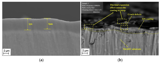 With reference to Figure 6 and Table 6, it can be possible to conclude that the golden substance on the surface of the sample in Figure 9 is TiN, and the black substance is the Ti6Al4V matrix. It can be seen from Figure 4b and Figure 9a that the coating has not been removed, only a large area of cracks and a few pit defects were generated on the surface of the coating, and no Ti6Al4V was exposed. However, as the laser energy increases, as can be seen in Figure 4d and Figure 9b, the cracks and pit defects of the coating increased, and a small amount of Ti6Al4V was exposed, but most of the coating is still not washed away. In addition, in Figure 9b, while Ti6Al4V is exposed, it loses its original flat morphology and assumes a point-like convex shape. This is explained by the fact that sample 1 was cleaned with a lower energy laser, and the coating and the substrate only experienced thermal expansion. The thermal expansion caused the coating to crack and a small amount of TiN was peeled off on the surface of the sample pit defects are generated [34]. After the laser energy increases, the melting point of TiN is higher than that of Ti6Al4V, so the substrate melts before the coating [31,35]. At the same time, the cracks on the surface of the coating also gradually increased, and the size of the pits gradually increased. The molten Ti6Al4V oozed out of the pits and cracks, and after cooling, the morphology shown in Figure 9 was formed.