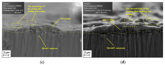 Figure 4c shows the cross-sectional view of sample 2 after laser cleaning. In the figure, the surface of the sample becomes rougher and there are some spherical convex parts on the surface of the sample. Compared with sample 1, the coating thickness of sample 2 is significantly reduced (the thicker area is 2–3 μm, the thinner area is only 1–2 μm).Compared with Figure 4a, in the part where the substrate is separated from the coating in Figure 4c, the morphology of the substrate is very irregular, with protrusions and pits. The reason for this phenomenon is that after the separation between the coating and the substrate due to thermal expansion, the laser pulse frequency increased from 100 to 200 KHz, and the sample received more heat transferred by the laser at the same time. At this time, since the melting point of Ti6Al4V is lower than TiN, the substrate melts before the coating. After cleaning and cooling, the substrate returns from the molten state to a solid state, but due to the thermal expansion of the coating, the distribution of the substrate under the coating is irregular.