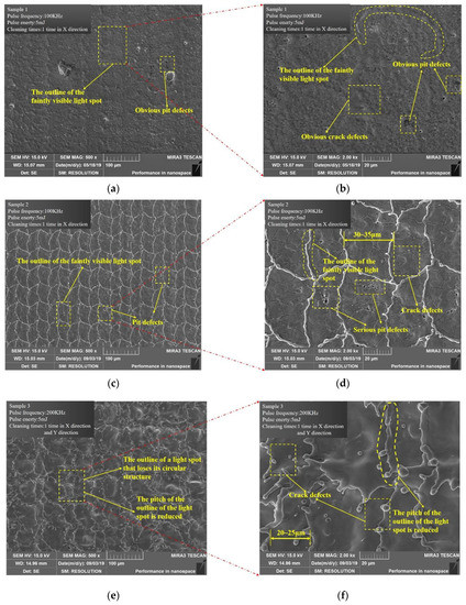 Through the electron microscope, we can observe the surface morphology of the sample after laser cleaning as shown in Figure 5. Figure 5a is the surface morphology of sample 1 after magnification of 500 times. It can be seen from the figure that the sample surface still maintains a relatively intact and flat morphology, but there is a faintly visible light spot profile left after laser cleaning, and it is accompanied by certain pit defects. By zooming in on the selected area in Figure 5a, we get a picture of the surface morphology after a magnification of 2000 times, as shown in Figure 5b. In Figure 5b, the pit defects on the surface of the sample are more obvious, and its size is about 5~10 μm. At the same time, crack defects appeared on the surface of the sample, but the size of the crack was small, and the outline of the spot left by the laser scanning surface was also clearer.