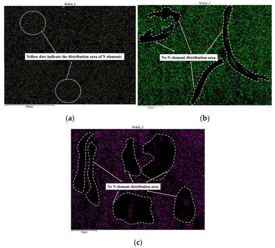 Figure 6 shows the distribution of N elements in a selected area of the sample surface. As shown in Figure 6a, a large amount of N elements is still distributed on the surface of sample 1, and there are no voids in the distribution. In Figure 6b, although a large amount of N elements is distributed on the surface of the sample, some voids appear in the figure, and the shape and distribution of these voids are generally consistent with the outline of the light spot. In Figure 6c, the area and number of such voids increased, and their distribution is no longer consistent with the spot contour tracks.