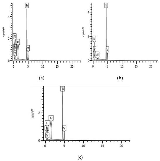 It can be seen from Figure 4f that irregularly distributed substances appear on the surface of the sample. Combining Figures 4c and Figure 9c, it can be concluded that these irregularly distributed substances are the matrix Ti6Al4V. Comparing Figure 9b,c, it can be seen that the golden yellow TiN morphology is destroyed, and TiN is distributed in the depressions and cracks between Ti6Al4V. The reason for the appearance as shown in Figure 9c is that when sample 3 is subjected to laser cleaning, the same laser parameters as sample 2 are used for cleaning, but the cleaning is performed from both X and Y directions. Although the energy of a single laser is not different, the increase in the number of cleanings causes the laser to transfer more heat to the sample surface. At this time, TiN and Ti6Al4V will melt. When the heat transferred by the laser is low, the sample first thermally expands, and at this time, the coating surface has cracks and depressions [33,34,35]. Subsequently, the laser transmission energy increases, and the underlying Ti6Al4V melts first, but this time the TiN coating continues to expand, and cracks and pits gradually increase [22]. Under the force of thermal expansion, a small amount of molten Ti6Al4V overflowed from the cracks and pits, and the coating also peeled off. When the laser energy is increased again, both the coating and the substrate are melted, and more Ti6Al4V is exposed. After cleaning, TiN and Ti6Al4V cooled to form the morphology shown in Figure 9c.