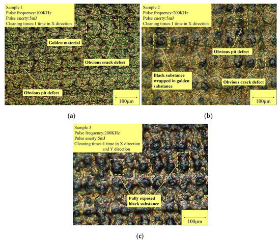 To observe the morphology of the surface of the sample after cleaning more clearly, and to determine the difference between the substance distributed along the outline of the spot and the substance inside the spot, the surface morphology of the sample is now observed under the light microscope. Figure 9 shows the surface morphology of the three samples under the light microscope. Figure 9a is the surface morphology of the surface of sample 1 magnified 560 times. It can be seen that the surface of the sample is covered with golden yellow material, and the flatness of the sample surface is poor with obvious cracks and pit defects. Figure 9b is the surface morphology of sample 2’s surface magnified 560 times. From this figure, it can be clearly observed that the black material surrounded by the golden material appears on the surface of the sample, and the cracks and pit defects are more obvious [34]. Figure 9c is the surface morphology of sample 3 magnified 560 times. It can be seen from the figure that a large amount of black material is exposed on the surface of the sample, and the flatness of the surface is extremely poor, while the golden material is distributed in the depressions between the black materials.