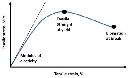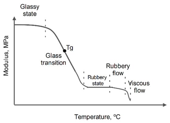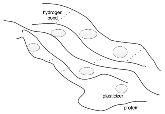 Protein film formation occurs through the denaturation of the initial material by heat, solvent utilization, and pH. In general, biopolymers are not thermoplastic and are liquefied only by adding some plasticizers. The absence of plasticizers leads to thermal degradation [21]. Temperatures above the glass transition (Tg) (Figure 1) undergo the transformation of proteins by molecules disaggregation, unfolding, dissociation, and straightening; molecules are reuniting through other links while the material becomes soft, elastic, and configurable in any shape. The cooled material acquires improved properties and structure due to the new covalent, hydrogen, ionic links formed. Operational parameters such as temperature, plasticizer (type and concentration), pH, etc. are important in film formation.