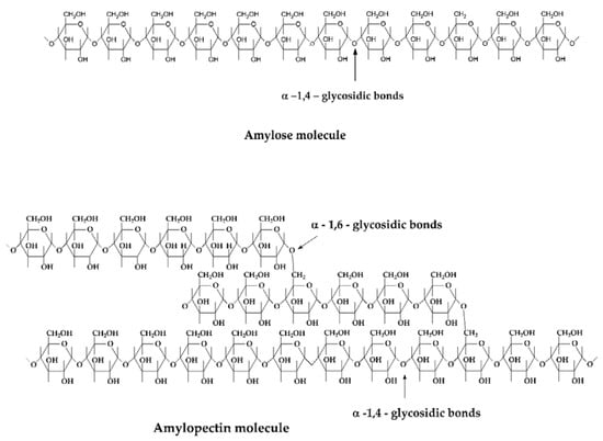Starch (Figure 2) is an abundant natural compound that is present in all plant components (stem, seeds, fruits, roots, etc.). It is the plant “battery” since it represents energy storage in chemical form, but also the main energy source for animals and humans (60–70% of the human caloric intake comes from starch). Starch consists of two different polysaccharides: amylose composed of D-glucose residues with α-(1→4) linkages—linear and amylopectin formed and α-(1→4) linkages and approximately 6% α-(1→6) linkages as branches from the parent molecule. Both are comprised of water-insoluble granules with different shape, morphology, and crystallinity for different sources. Starch possesses thermoplastic characteristics in the presence of plasticizers, high temperatures, and mechanical pressing. In this respect, starch is similar to other synthetic polymers; hence, the operation implemented to other polymers can be applied to starch also. Therefore, to give starch a new shape, a thermomechanical process is needed (extrusion, injection, kneading, molding, casting, all in the presence of heat, water, and appropriate plasticizers). A novel and efficient approach [77] to obtain thermoplastic starch consists of using sodium hexametaphosphate (SHMP)/polyvinyl alcohol fibers (PVAF) as cross-linking agents and the following procedure: SHMP and PVAF are mixed in solution, starch and glycerol were added to solution, the mixture was submitted to extrusion, granules were obtained, and granules were molded in films. In this process, SHMP produces cross-linking between starch molecules and PVAF.