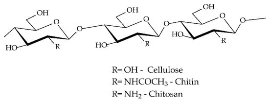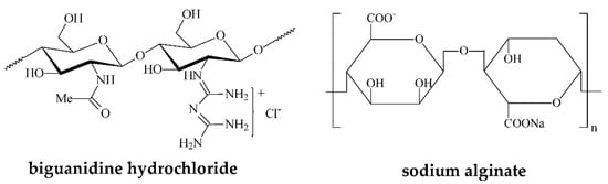 Chitosan (Figure 3) is a well-known polysaccharide derived from chitin with countless uses due to its properties [98,99,100]: it is a natural linear polymer that is non-toxic and therefore safe for the food industry, biodegradable, antitumoral, fungistatic, hemostatic, anticholesteremic, antioxidant, antacid, colon targeting, analgesic, etc. Chitosan is mainly insoluble in water, but it becomes soluble in acidic solutions (acetic acid, formic acid, etc.). If the deacetylation degree exceeds 50%, the solubility increases, too. When chitosan is introduced in the acidic media, the chain-linked amino groups become protonated, and the chitosan shifts into a cationic state. Hence, positive charged chitosan acquires antimicrobial properties since it interacts with the negative surface of cell membranes, leading to bacteria deactivation.
