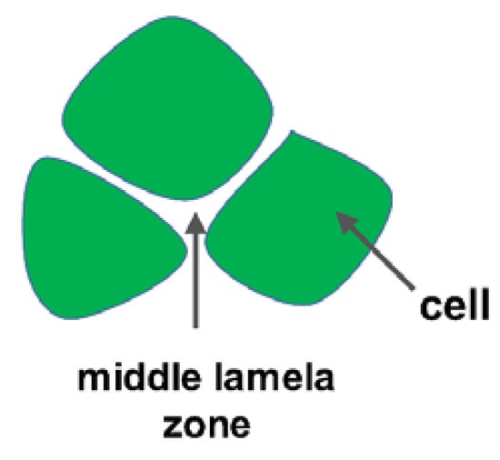 Pectin is an important polysaccharide considering the structural role in plant tissues. Pectin’s biological function is to reticulate the cellulose and hemicellulose fibers, producing a more resistant structure. It is found in almost all plants in different concentrations mainly in the middle lamella layer between cells (Figure 4). Pectin is a generic name for a family of polymers which differ in terms of molecular weight, chemical configuration, and types and abundance of monosaccharide subunits: (rhamnogalacturonan I, rhamnogalacturonan II, and homogalacturonan) [102]. In a simply way, pectin is a chain of alpha -1,4,-linked galacturonic acid subunits (Figure 5) that have an “accordion-like” conformation which result in molecules with extensible characteristics.